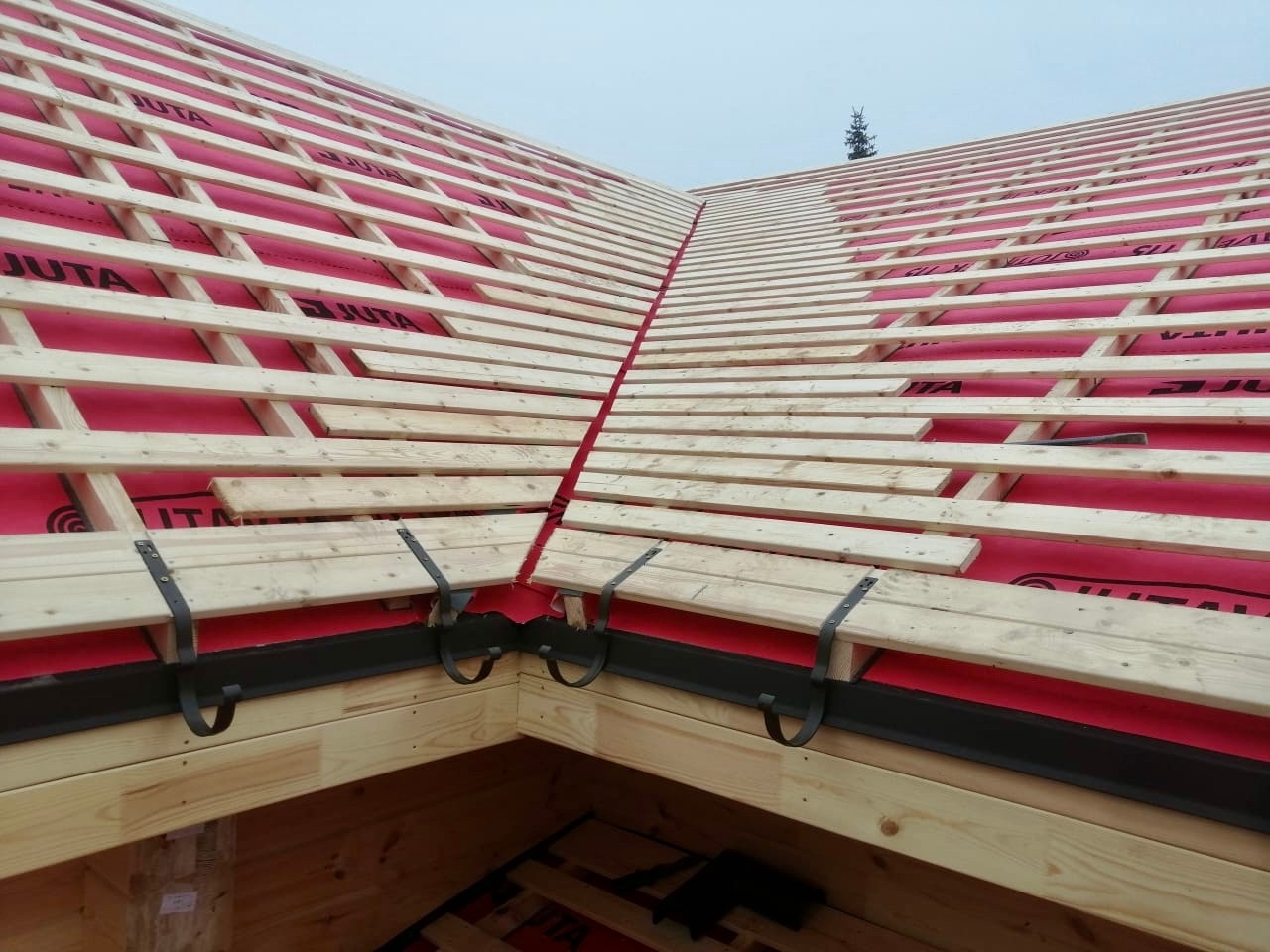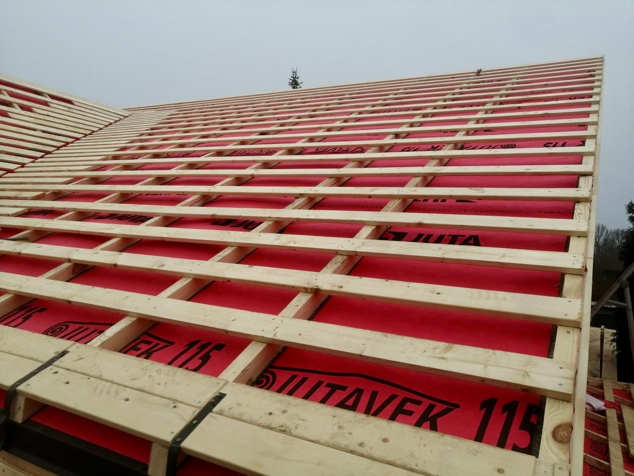 Это полностью индивидуальный проект нашего заказчика. Общая площадь дома составляет 182,8 квадратных метров. В строительстве мы использовали клееный брус собственного производства из сосны сечением 205х185(h) мм.