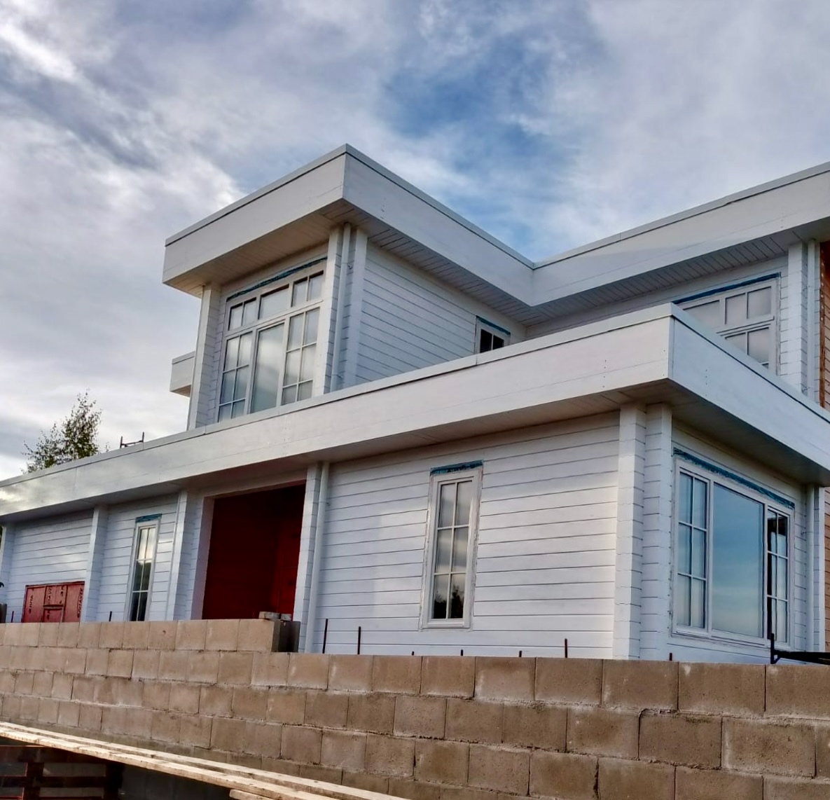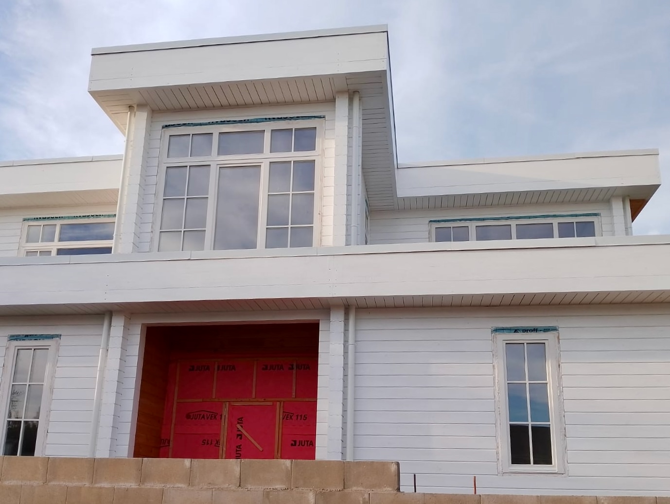 Дом строится из клееного бруса собственного производства из сосны сечением 205х185 мм. Общая площадь дома составляет 426,98 квадратных метров. Это полностью индивидуальный проект нашего заказчика.