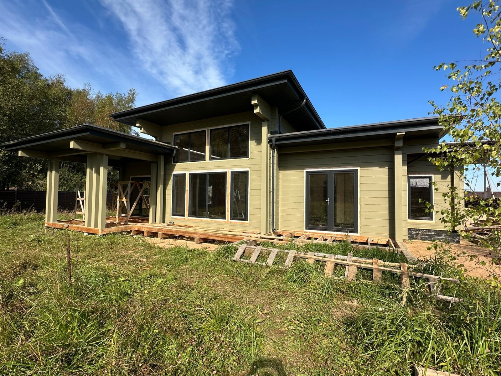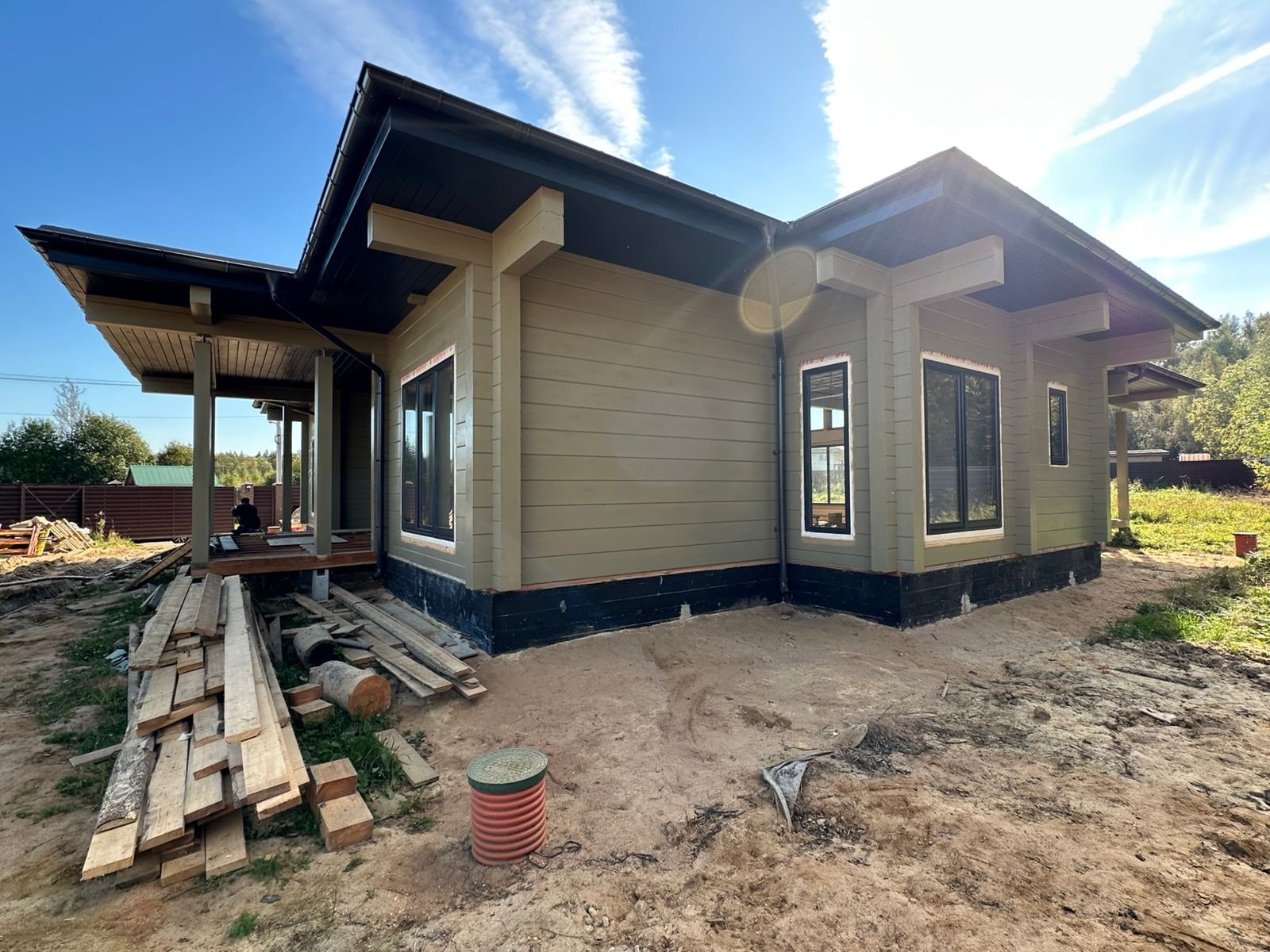 Наша бригада завершила внешнее окрашивание дома. В строительстве мы использовали клееный брус собственного производства из сосны сечением 205х270(h) мм. Это полностью индивидуальный проект нашего заказчика. Площадь дома составляет 290,23 м2.