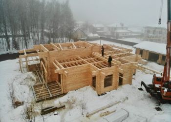 Сейчас наша бригада выполняет монтаж балок перекрытия. В строительстве дома мы используем клееный брус собственного производства из сосны сечением 205х270 мм. Общая площадь дома составляет 290,23 квадратных метров. Это полностью индивидуальный проект нашего заказчика.