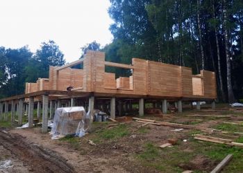 Наша бригада приступила к сборке сруба дома. В строительстве мы используем клееный брус собственного производства из сосны с сечением 205х185 мм. Это индивидуальный проект нашего заказчика. Общая площадь дома составляет 230 квадратных метров.