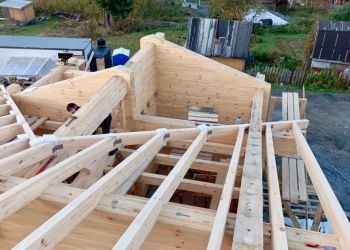 Наша бригада завершила работы по сборке сруба дома. Сейчас мы приступили к монтажу стропильной системы. В строительстве мы используем клееный брус собственного производства из сосны с сечением 245х185 мм. Это индивидуальный проект нашего заказчика. Одноэтажный дом с мансардой. Общая площадь дома 190,64 м2.