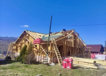 Сейчас наша бригада приступила к монтажу кровельного пирога. Дом построен из клееного бруса собственного производства из лиственницы с сечением 185х245 мм. Общая площадь дома составляет 428 квадратных метров.