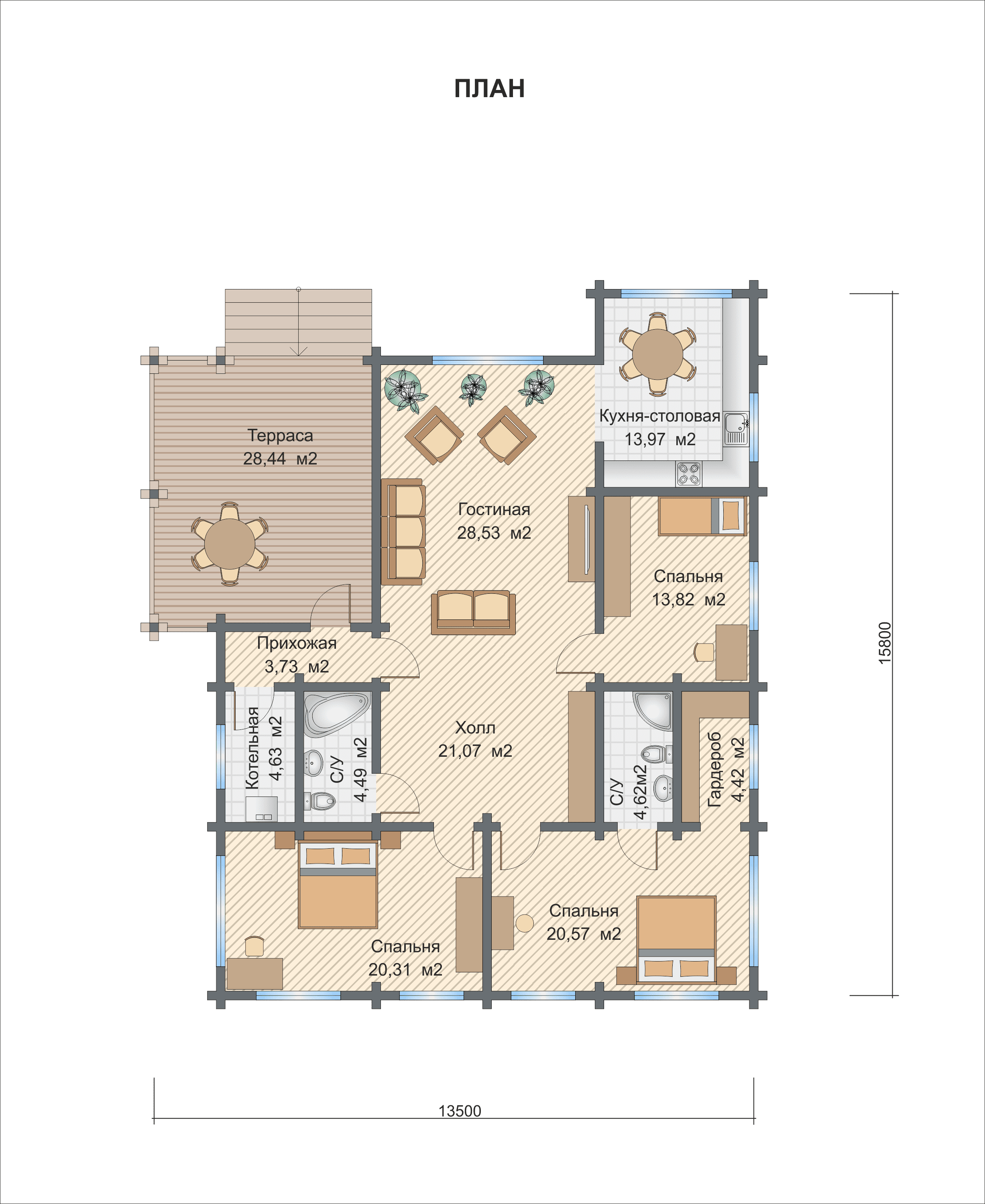 Полезная площадь проекта "Лион" - 169 кв.м. По проекту "Лион" - одноэтажное здание, которое также оснащено террасой. Площадь террасы – 28,44 кв.м.