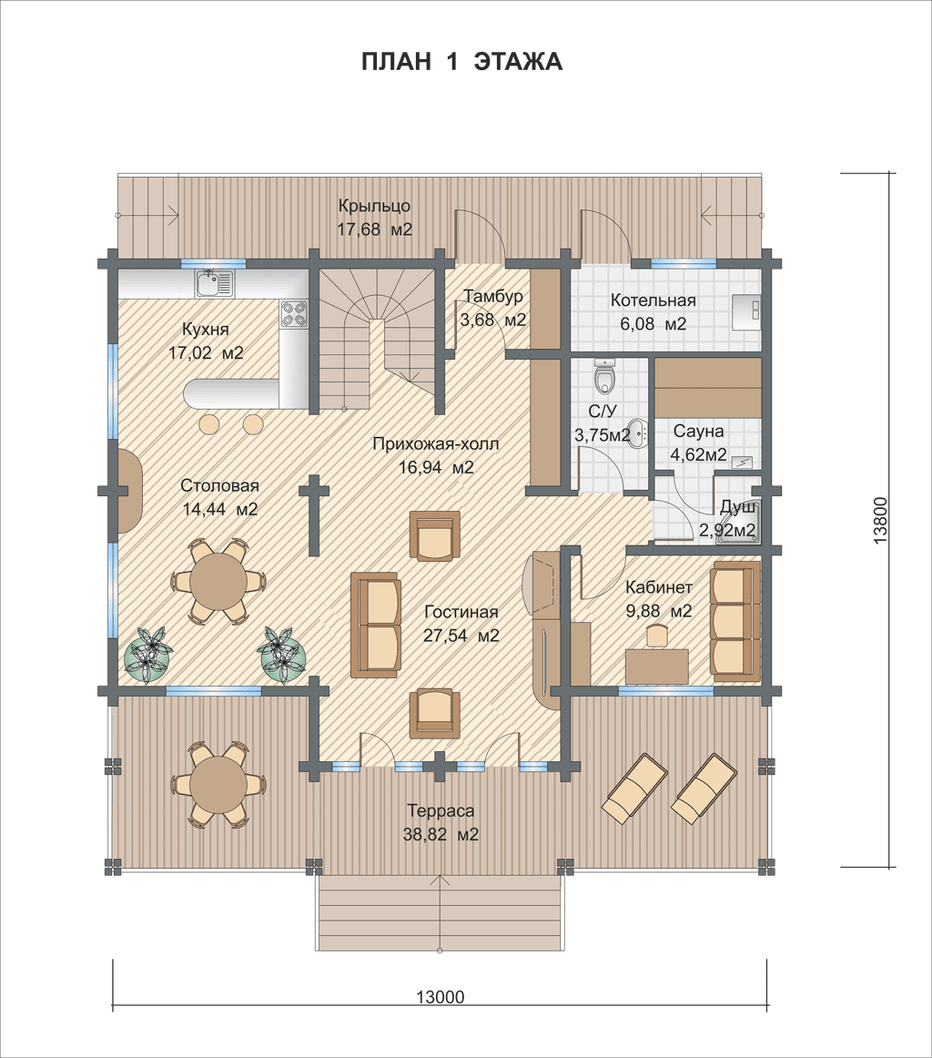 Полезная площадь проекта "Голубой Залив" - 257 кв.м. Площадь крыльца составляет - 17,68 кв.м., площадь террасы - 38,82 кв.м., площадь балкона - 11,84 кв.м.