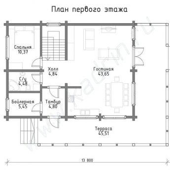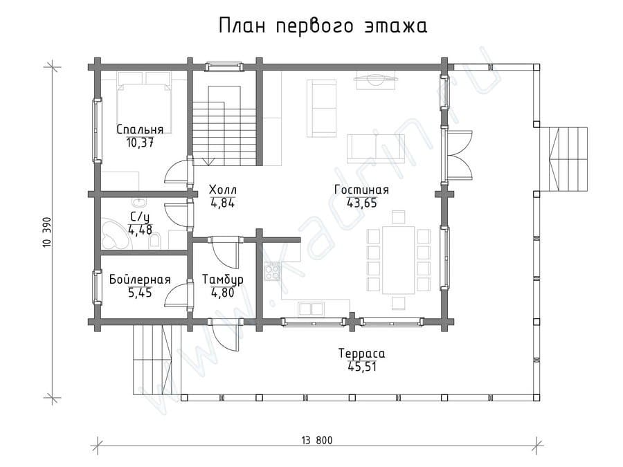 Также, в доме есть большая гостиная, совмещенная с кухней-столовой.