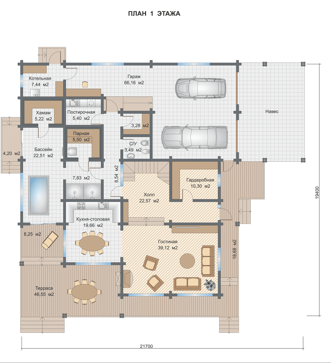 Полезная площадь проекта "Шату" - 417 кв.м. По проекту "Шату" - двухэтажное здание, которое также оснащено крыльцом и террасой. Площадь крыльца составляет - 8,25 кв.м., площадь террасы - 65,23 кв.м.