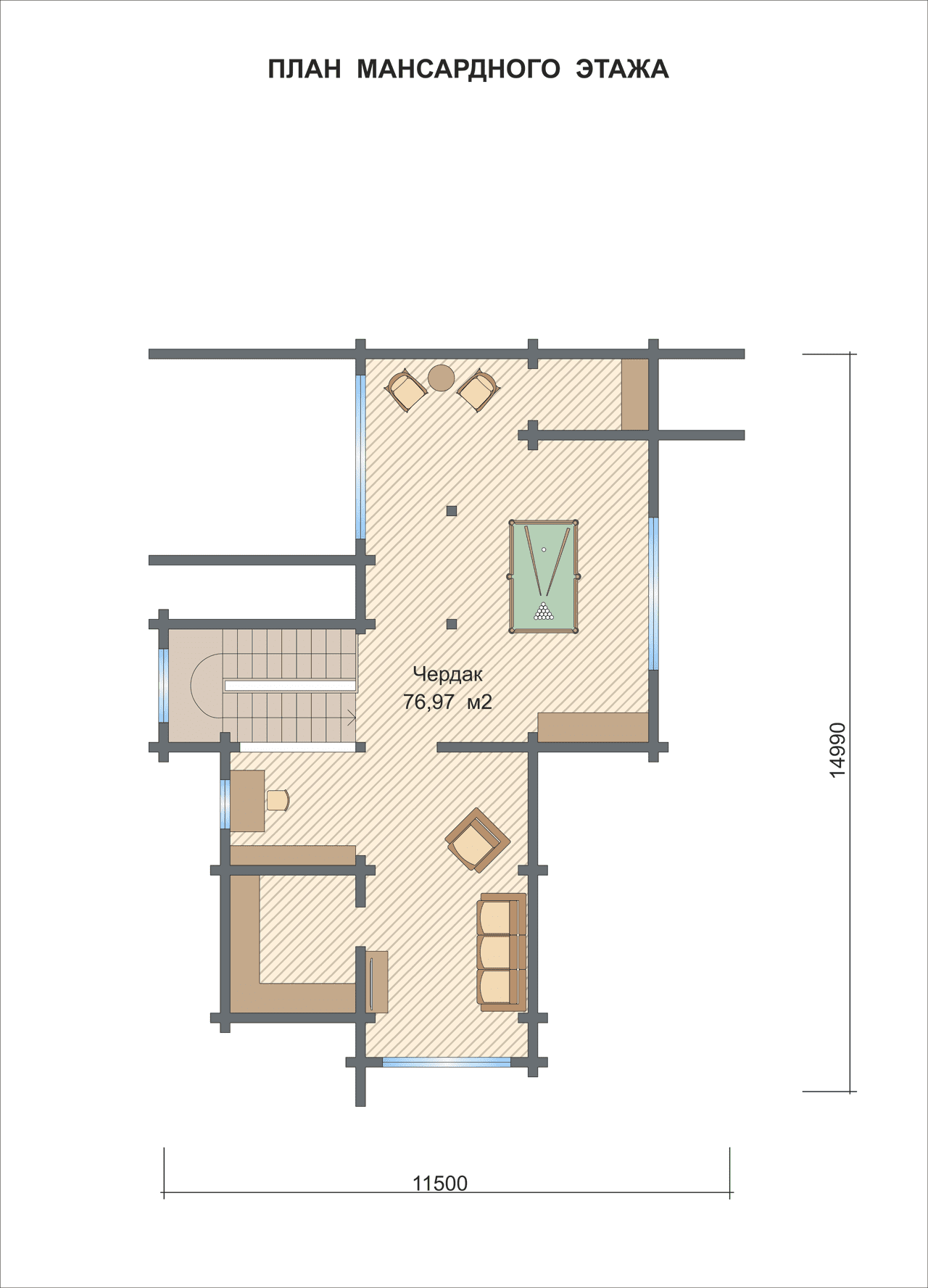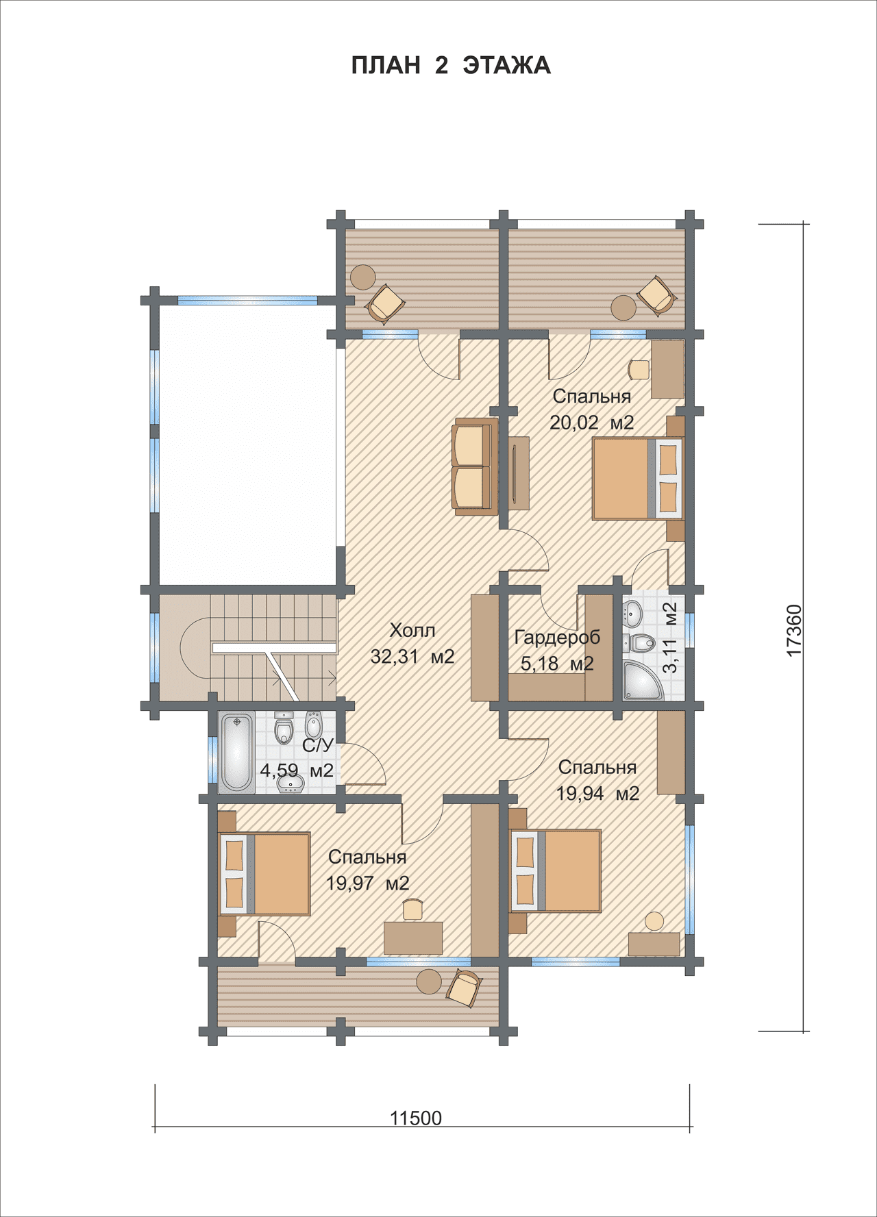 • стеновой комплект: брус клееный 185(h)х205 мм (сосна) с конструкционным запилом чашек под архитектурно-планировочное решение Заказчика